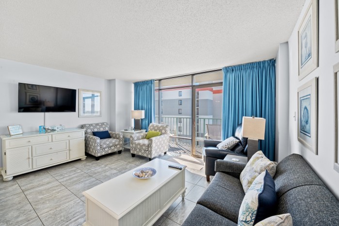 Sand Dunes South Tower 1451 Penthouse is the luxury rental of your dreams! This luxury ocean view rental includes three flatscreen TVs, wifi, and admittance to the fitness room and onsite restaurant. The rental can accommodate a group of 8 with its two-bedroom, two-bathroom layout.