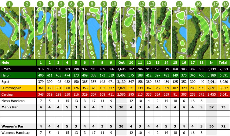 The open fairways wind through a natural, serene setting of hardwood trees and marshlands. Five sets of tees give every player a choice as to how difficult of a course they want to play. The lush fairways that lead to manicured greens are a pleasure for everyone.